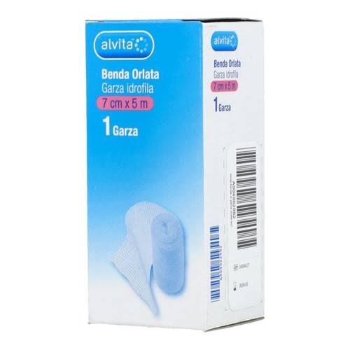 ALVITABENDA ORLATA Descrizione Garza idrofila naturalmente bianca. Non contiene coloranti. È lavabile e riutilizzabile. Non sterile. 100% cotone. Dimensioni: 7 cm x 5 m. Conservazione Conservare in luogo fresco e asciutto e lontano dalla polvere. Formato Confezione da 1 garza. Cod. 194012